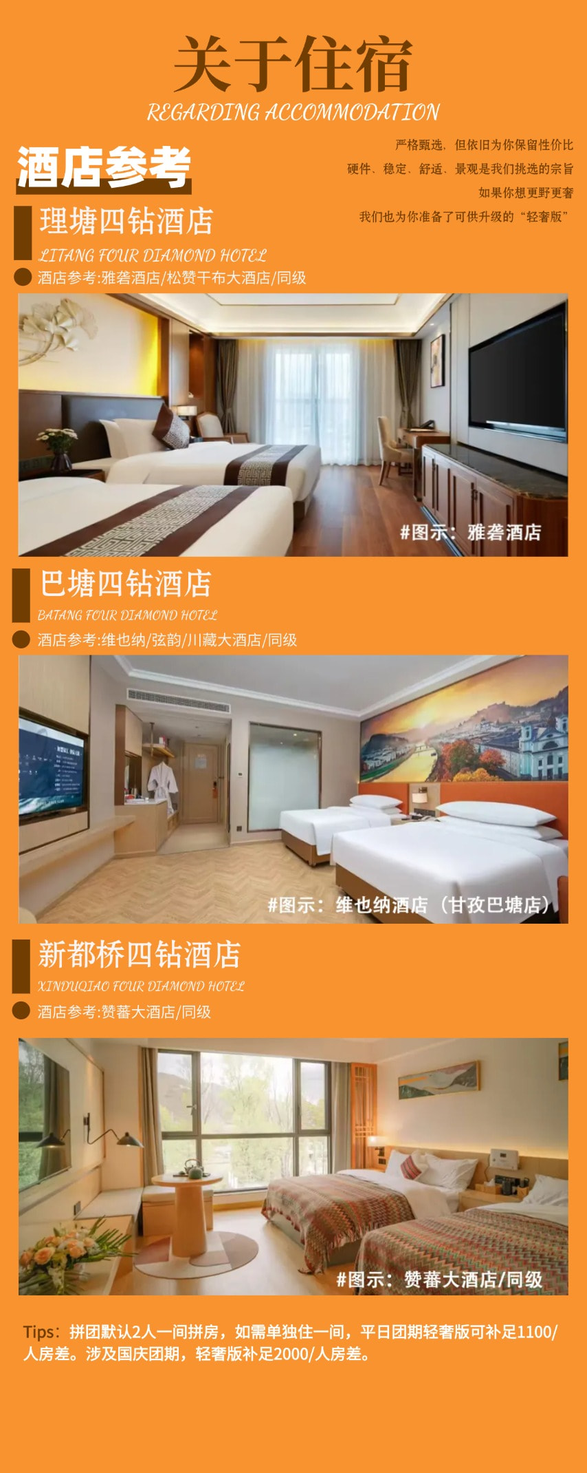 全程D1、D2、D4、D5共4晚4钻酒店住宿(含双早),D3下则通村/则巴村更好地藏式民宿,标准参考住宿板块