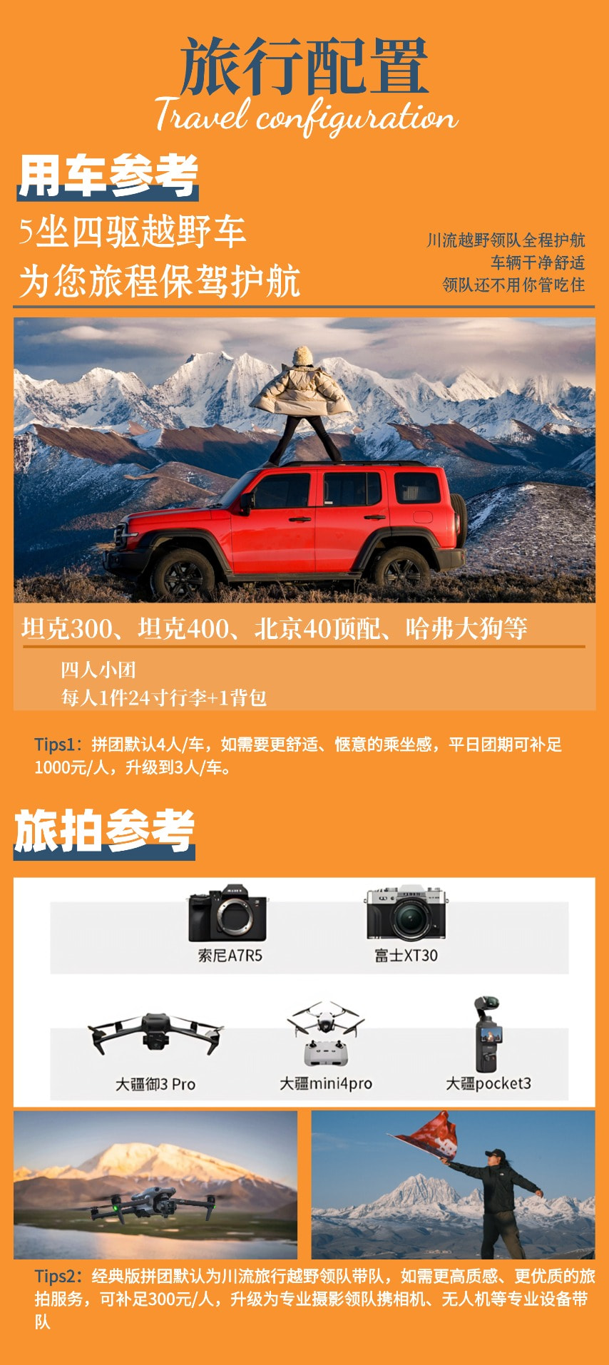 Tips2:轻奢版拼团默认为川流旅行越野领队带队,如需更高质感、更优质的旅拍服务,可补足300元/人,升级为专业摄影领队携相机、无人机等专业设备带队